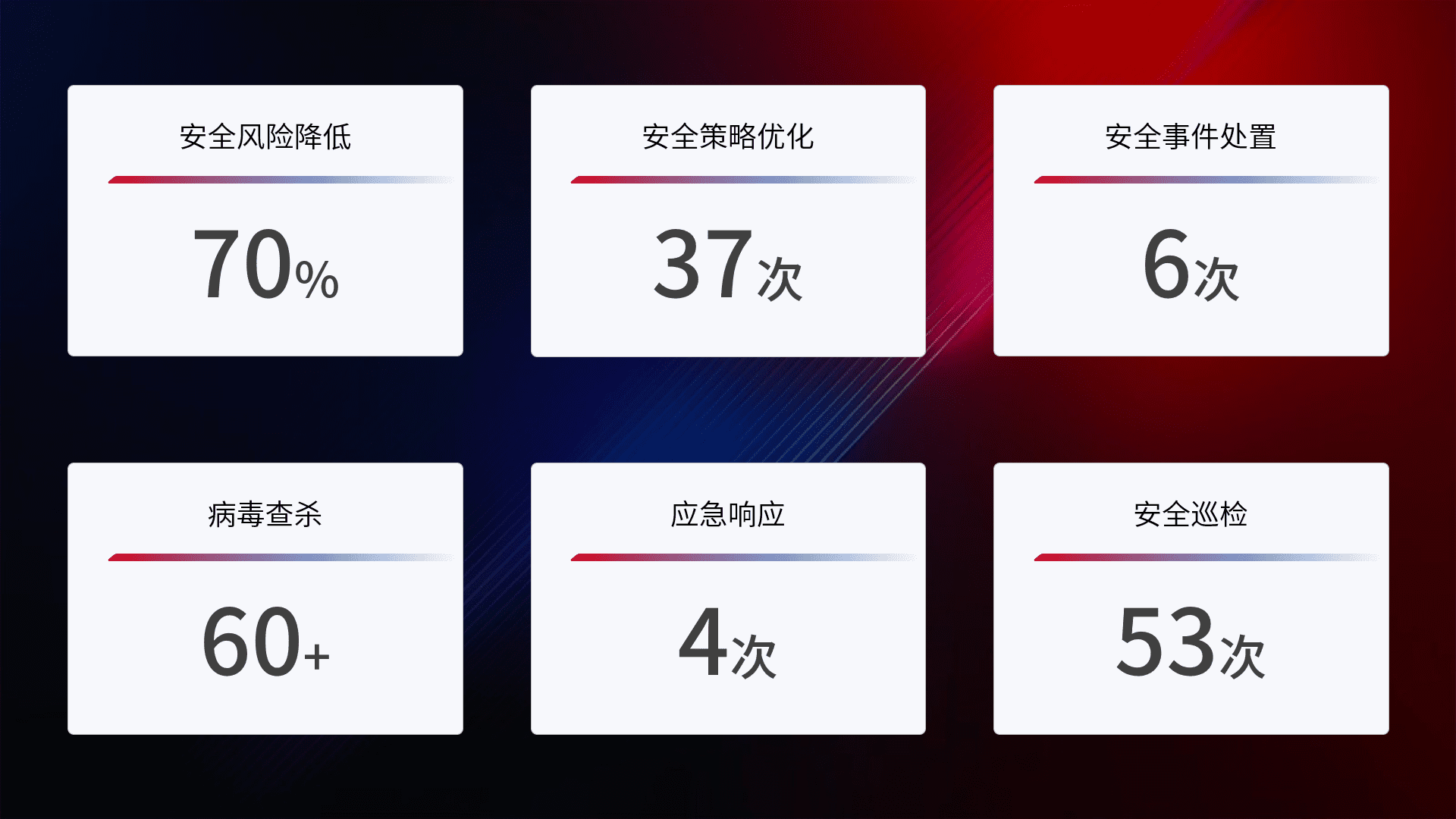 提供全面的安全事件报告体系,,,包括处置报告、、、周报、、季度和年度总结,,结合持续监控,,,,帮助客户深入了解网络安全状况。。。
