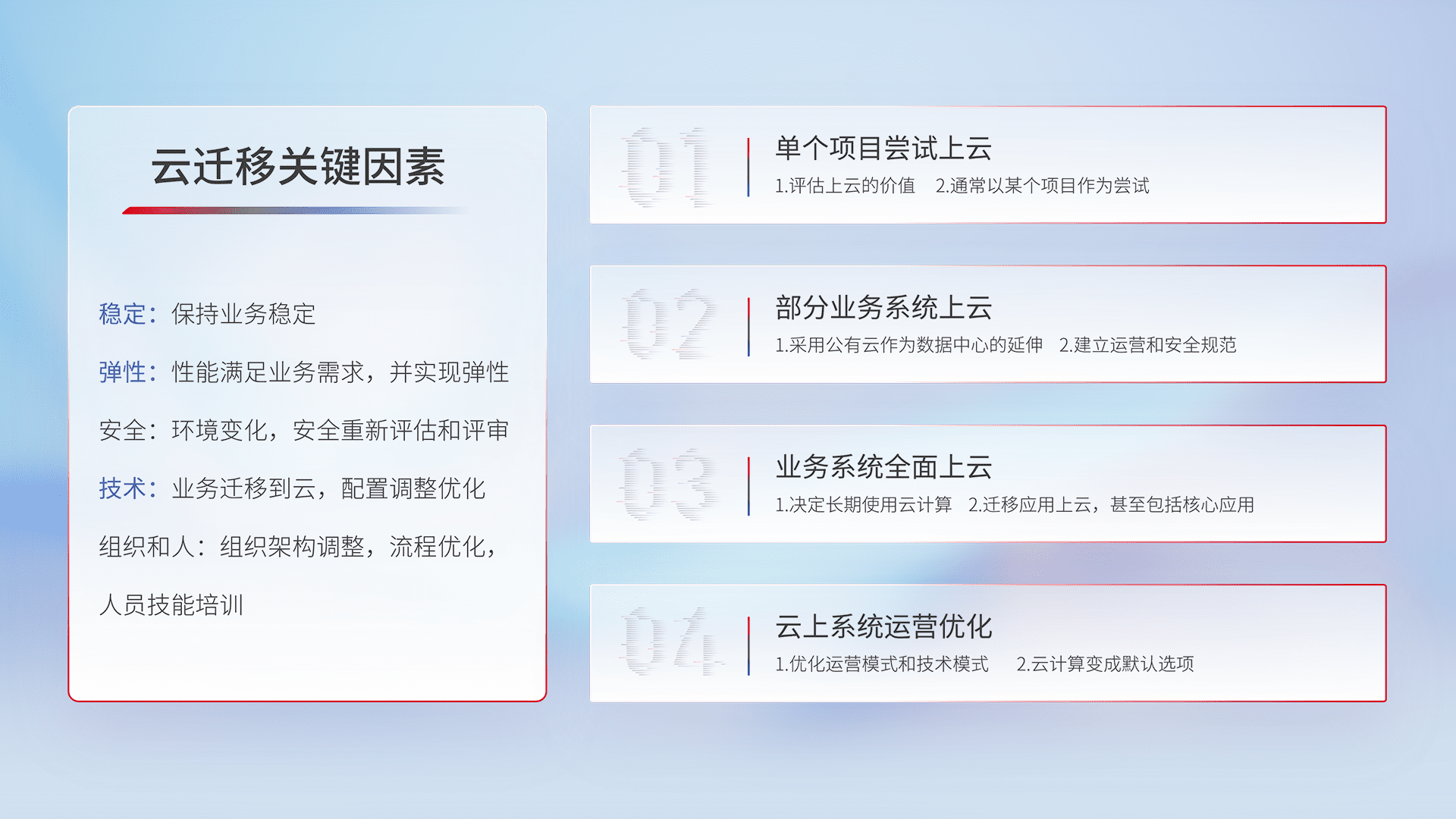结合实际业务,,,从规划设计、、、、云平台选型、、、、云原生改造、、、、数据迁移、、集成交付,,迁移全过程为客户识别最佳上云路径,,做好风险识别管理,,,,设计网络架构、、身份权限、、、安全审计合规、、、操作审计、、、日志审计、、、监控告警策略、、、、多站点容灾设计等,,对云上基础设施进行整体规划,,提升IT治理水平,,,以满足弹性、、、、高可用、、、高性能的需求。。